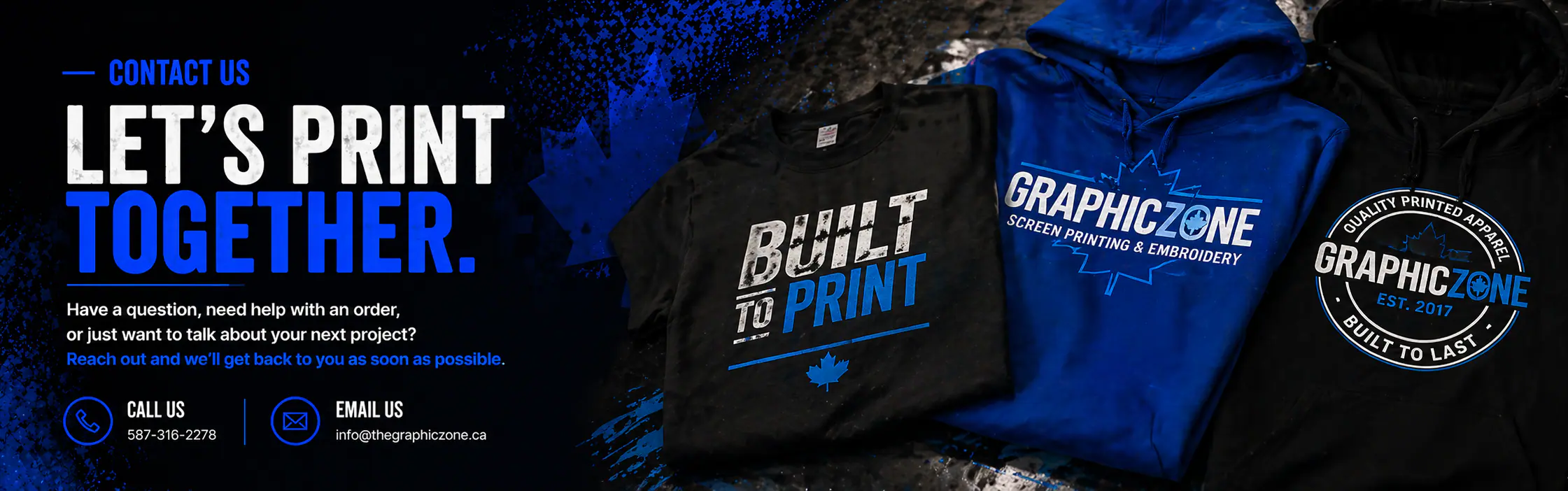 Looking to get started on custom apparel, screen printing, or embroidery? Contact GraphicZone today for a fast, no-obligation quote. We work with businesses, teams, and organizations across Okotoks, Calgary, and surrounding areas to deliver high-quality custom apparel and print solutions.