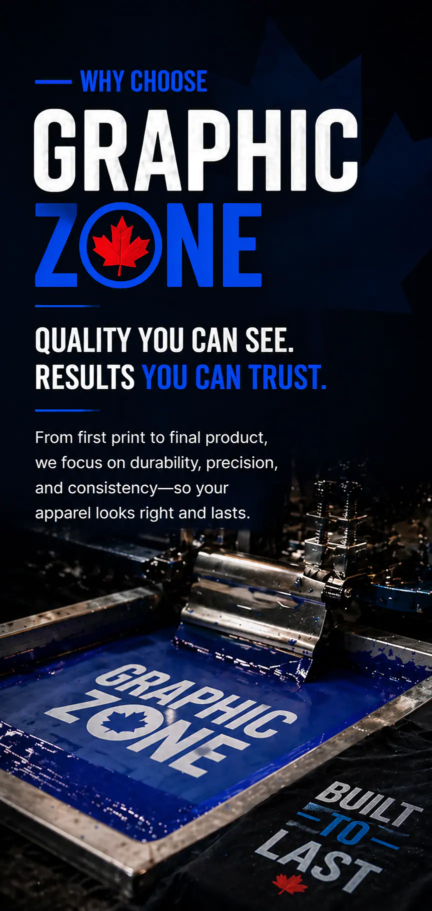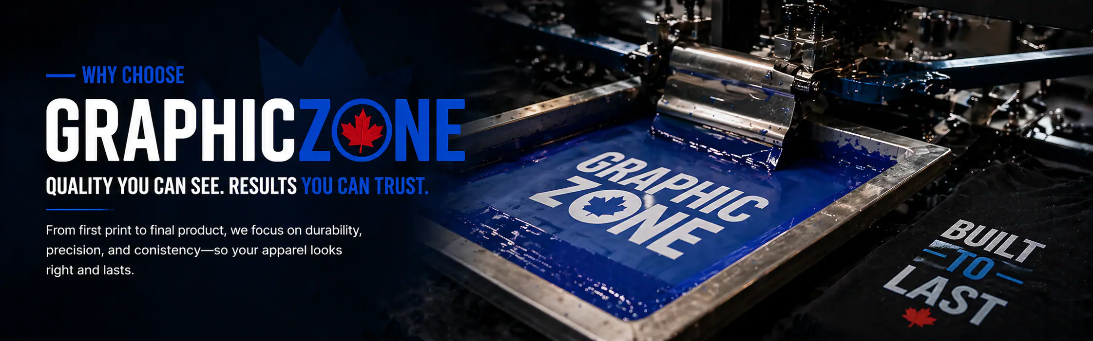 At Graphic Zone, we provide high-quality custom apparel printing and embroidery for businesses, teams, and brands across Alberta. Our focus is simple — deliver durable prints, consistent results, and a smooth, reliable experience from start to finish.